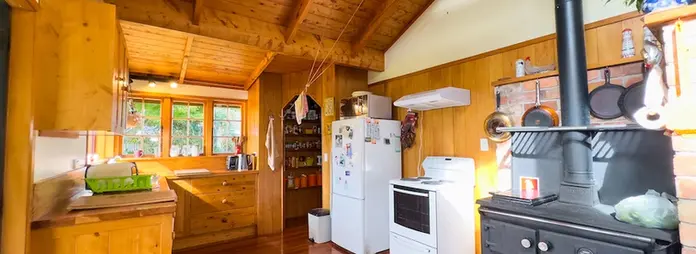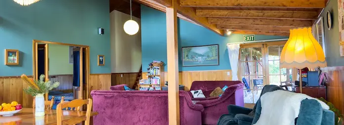 The Main House with hard wood floors and Kauri panelling has a fully equipped, shared kitchen, two bathrooms and a comfortable, large lounge and dining area. An extensive wrap around deck with BBQ area and plenty of seating faces the pool and the orchard.